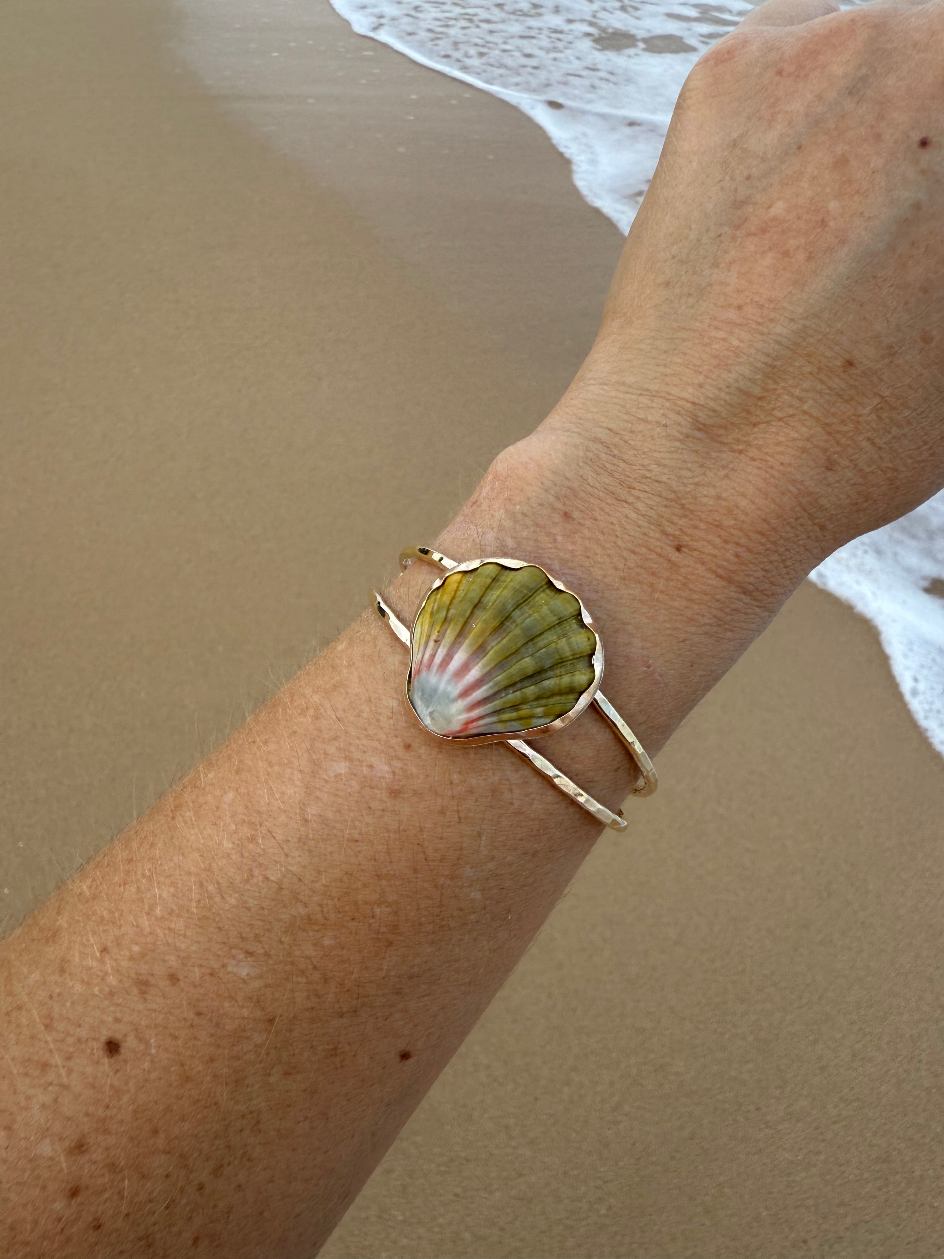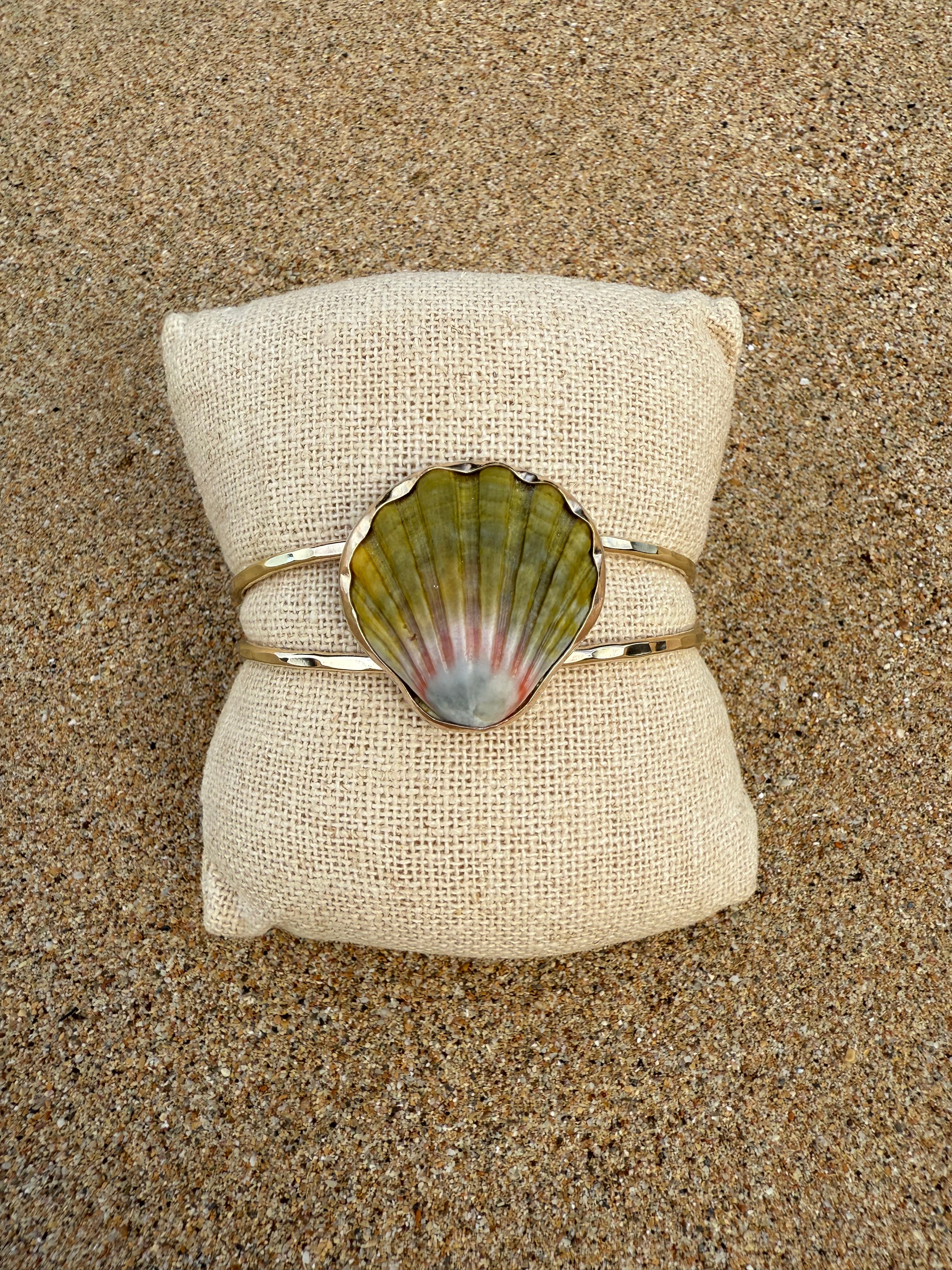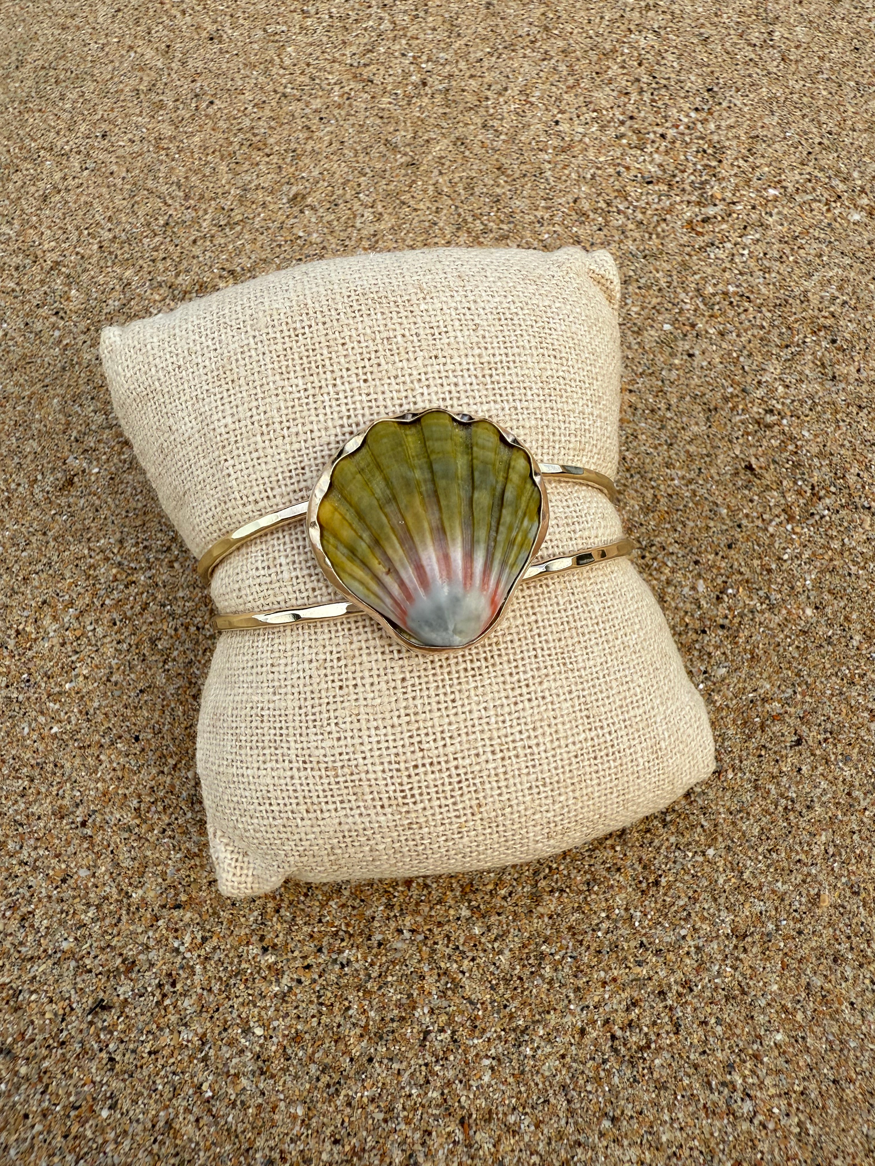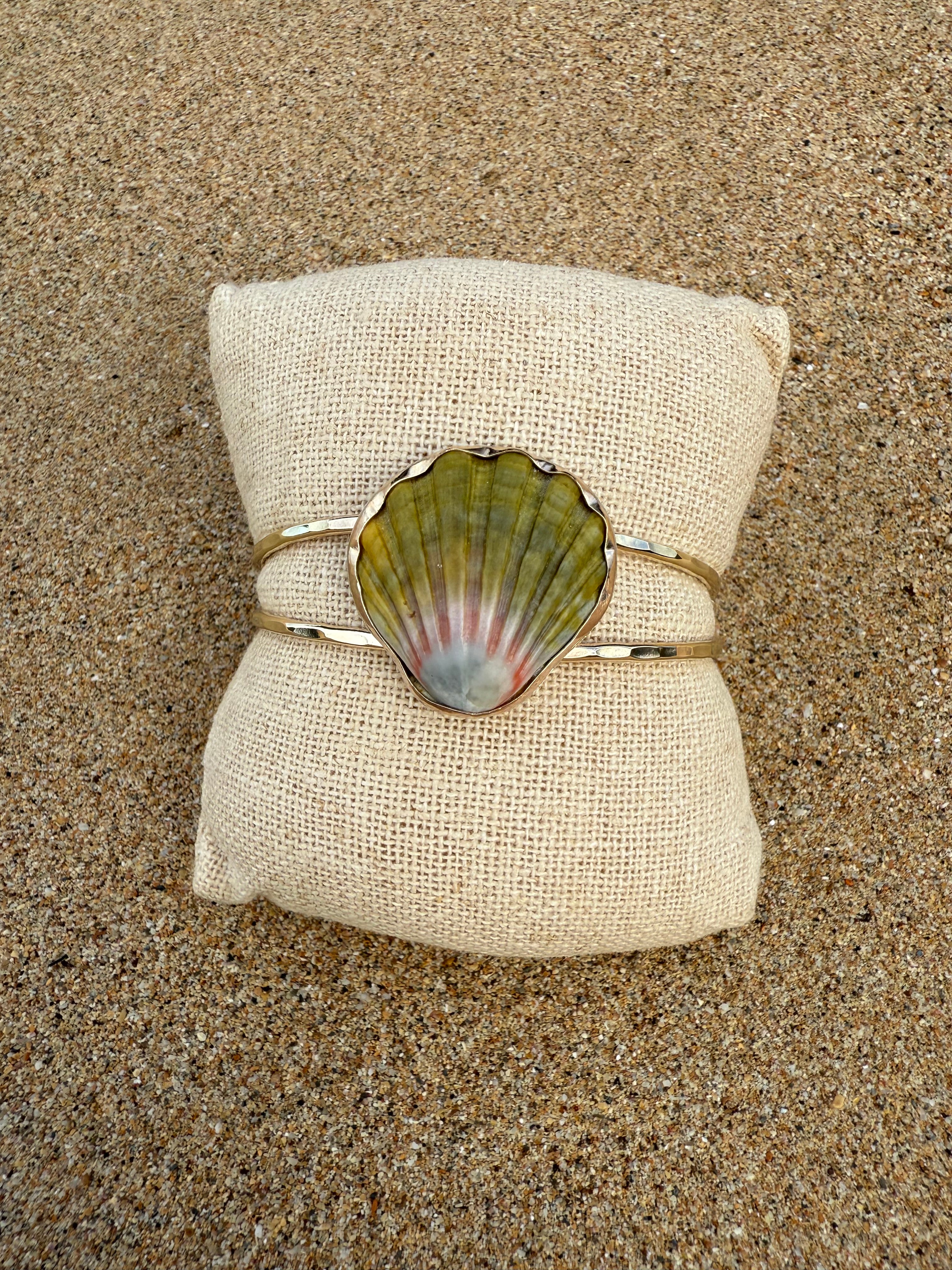 This moonrise shell has been bezel set into a gold filled bezel with a hammered gold fill band. The backplate of the moonrise shell is sterling silver however it is not seen when worn. This cuff is slightly adjustable conforming from small to medium wrists.