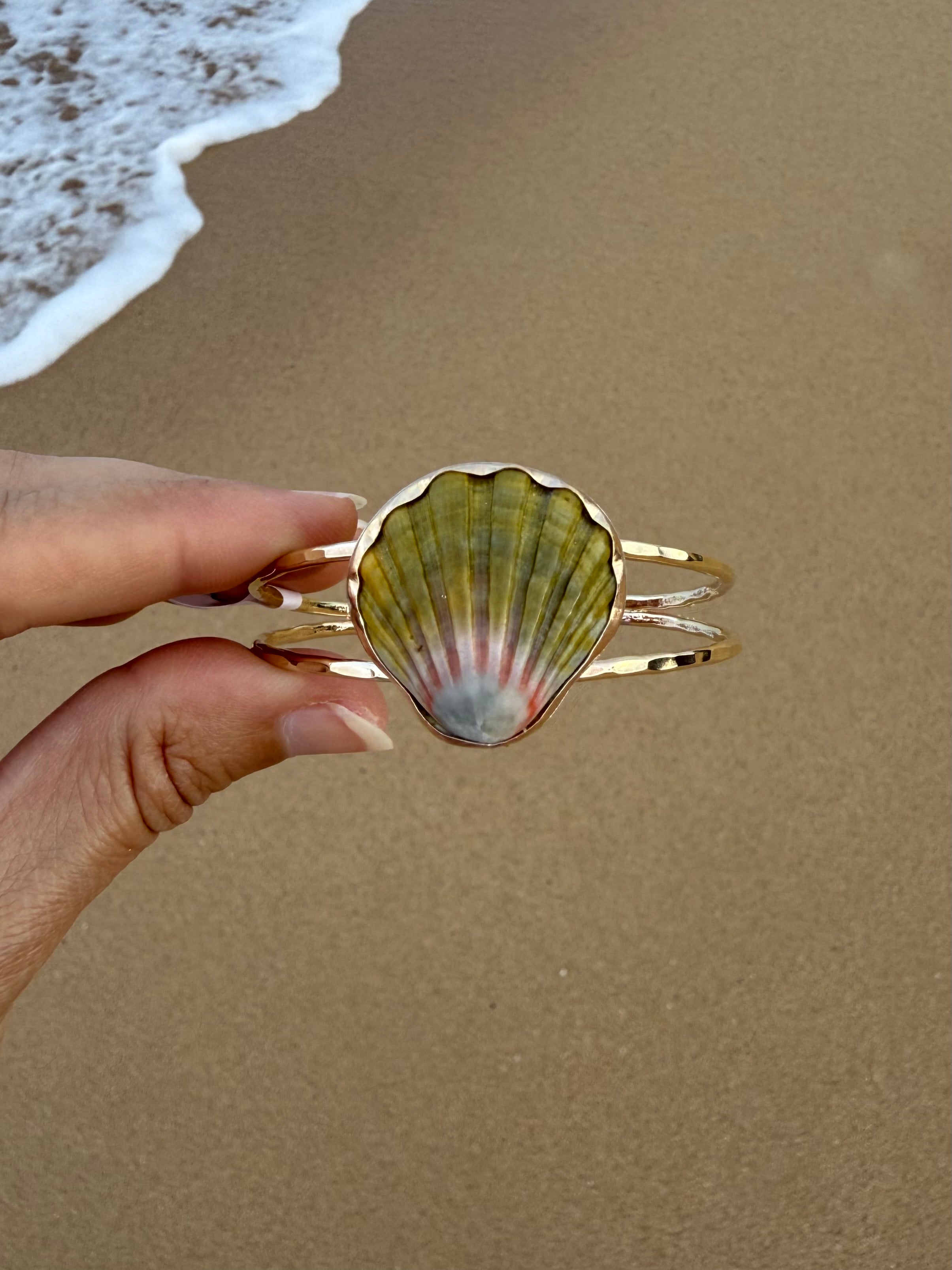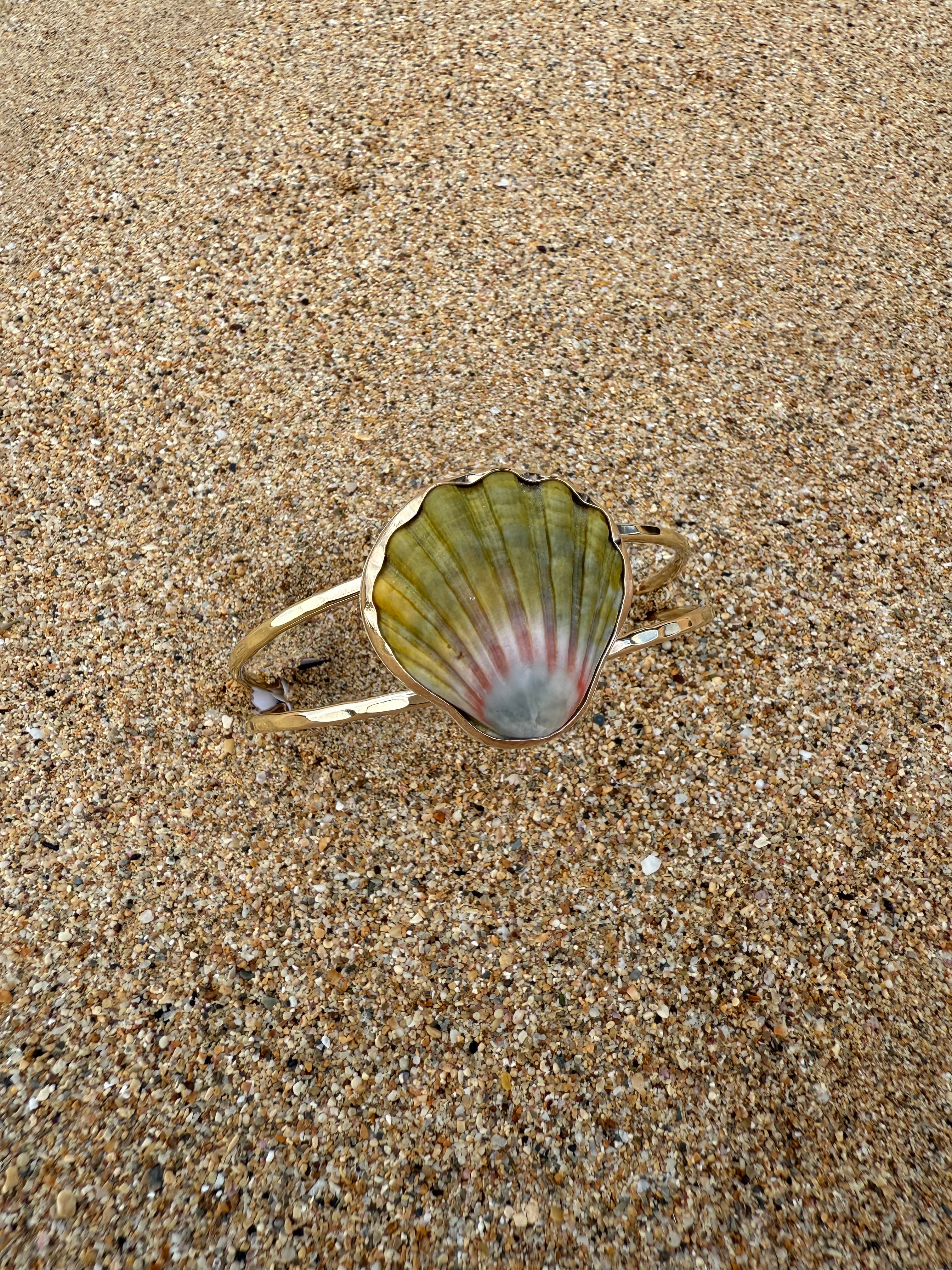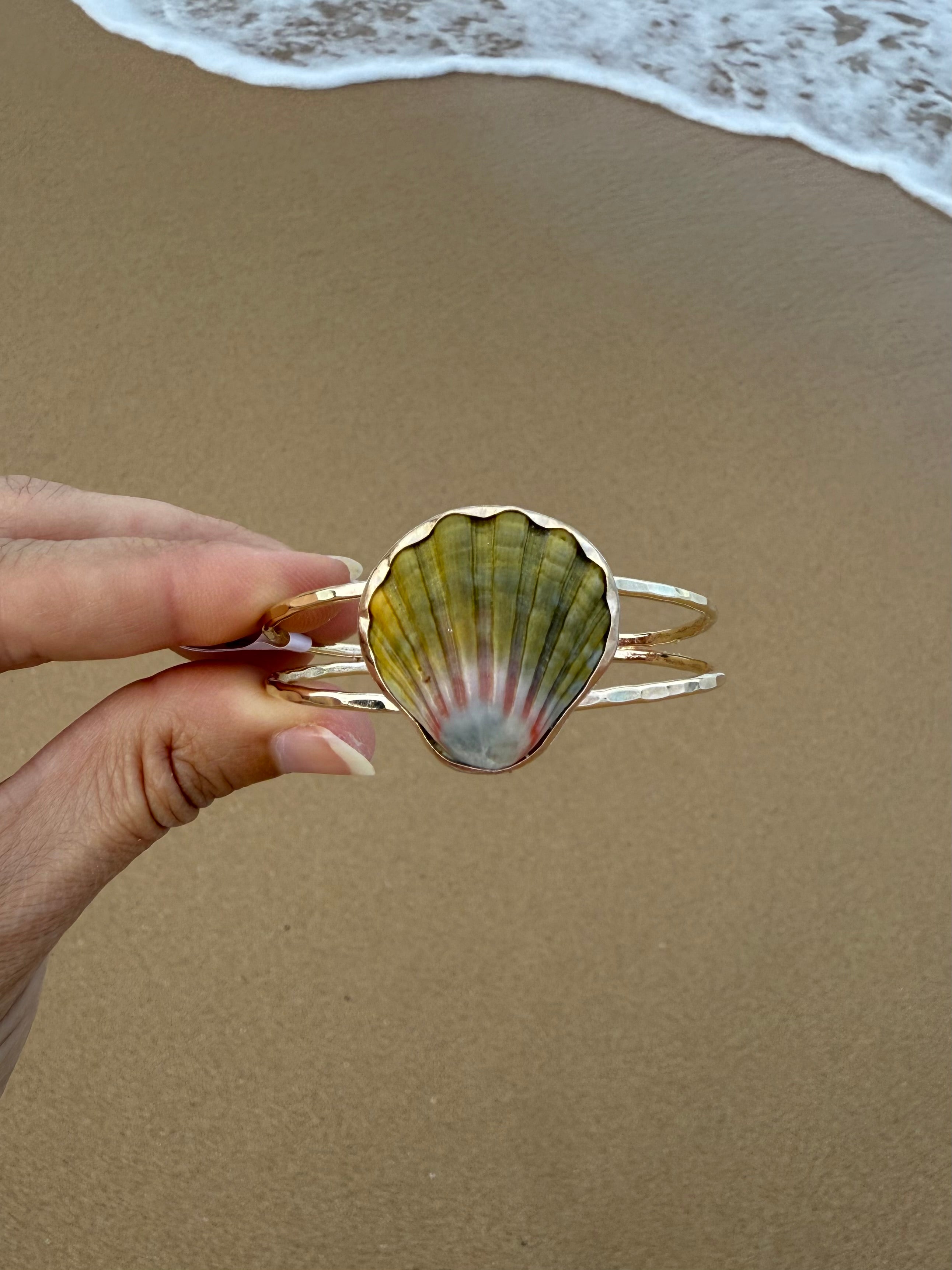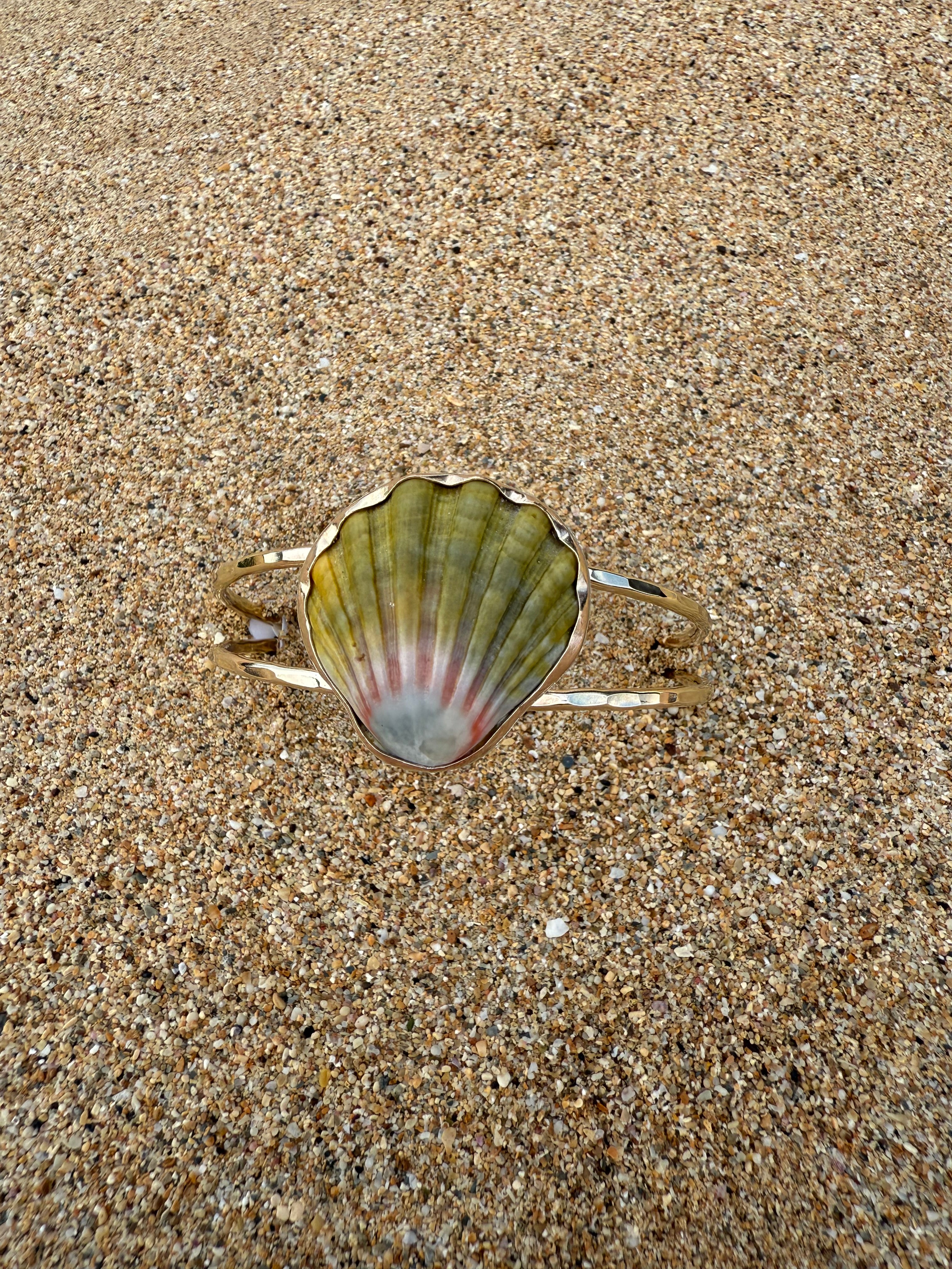 This moonrise shell has been bezel set into a gold filled bezel with a hammered gold fill band. The backplate of the moonrise shell is sterling silver however it is not seen when worn. This cuff is slightly adjustable conforming from small to medium wrists.