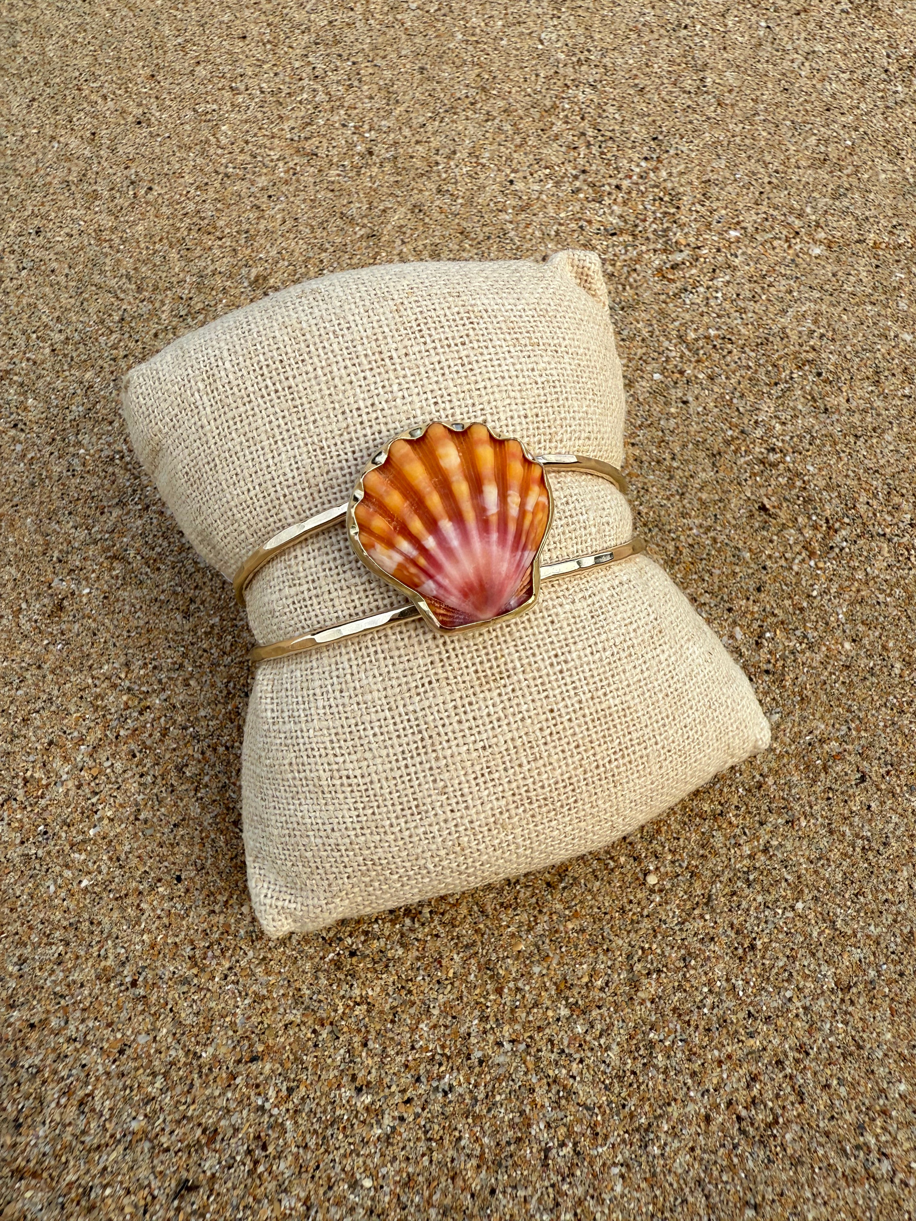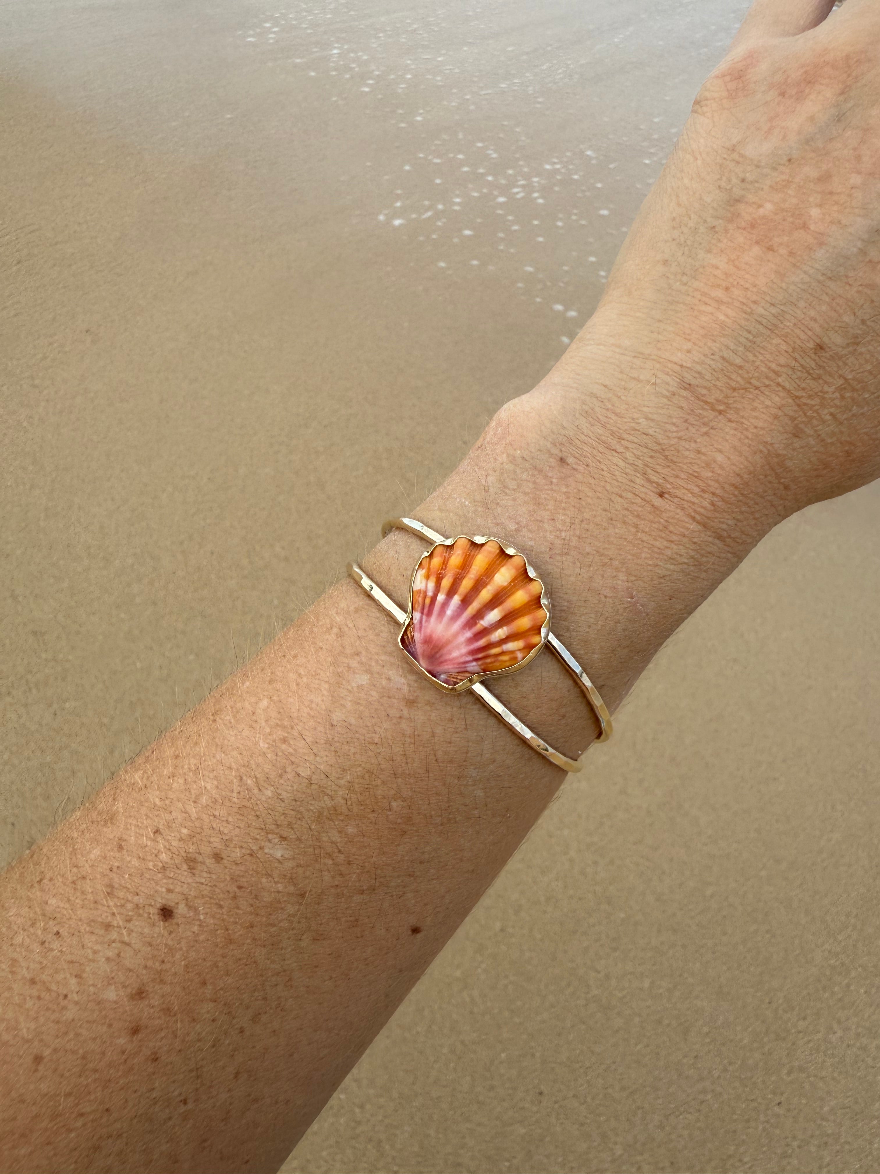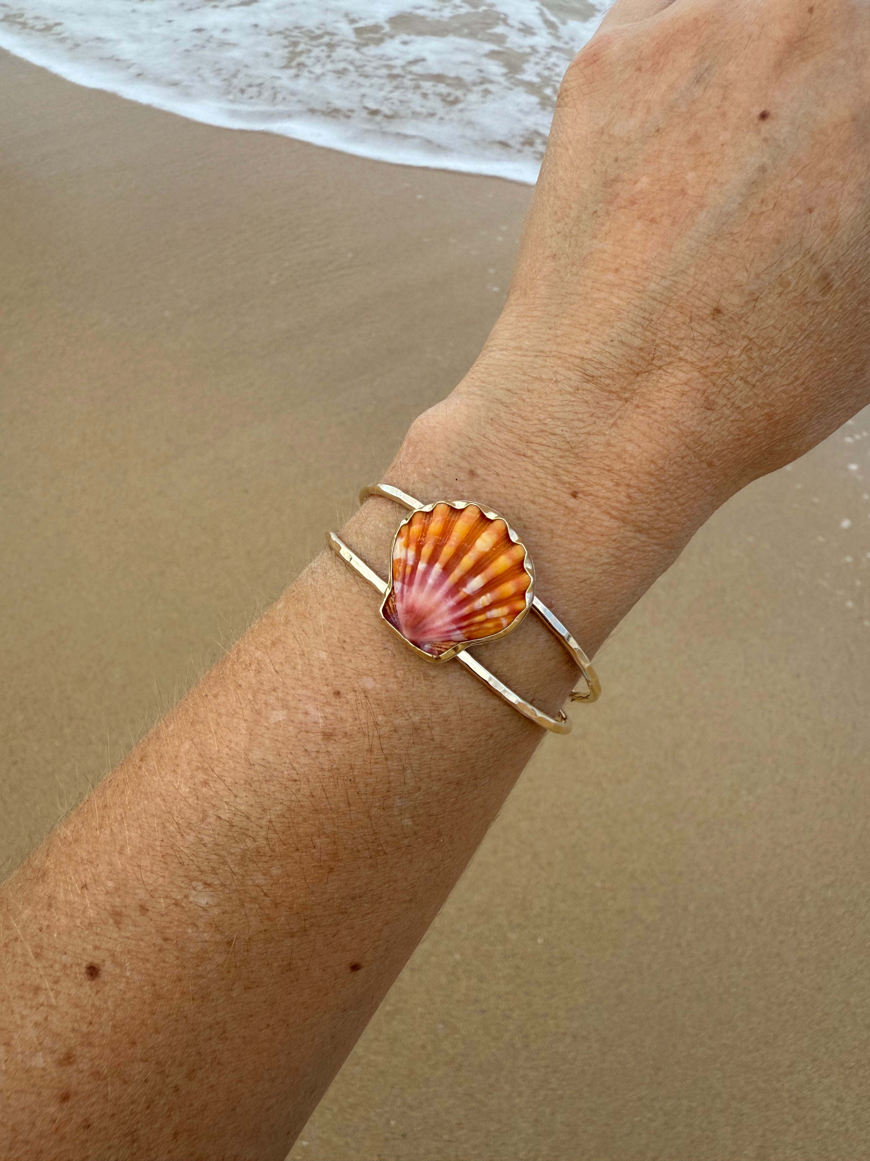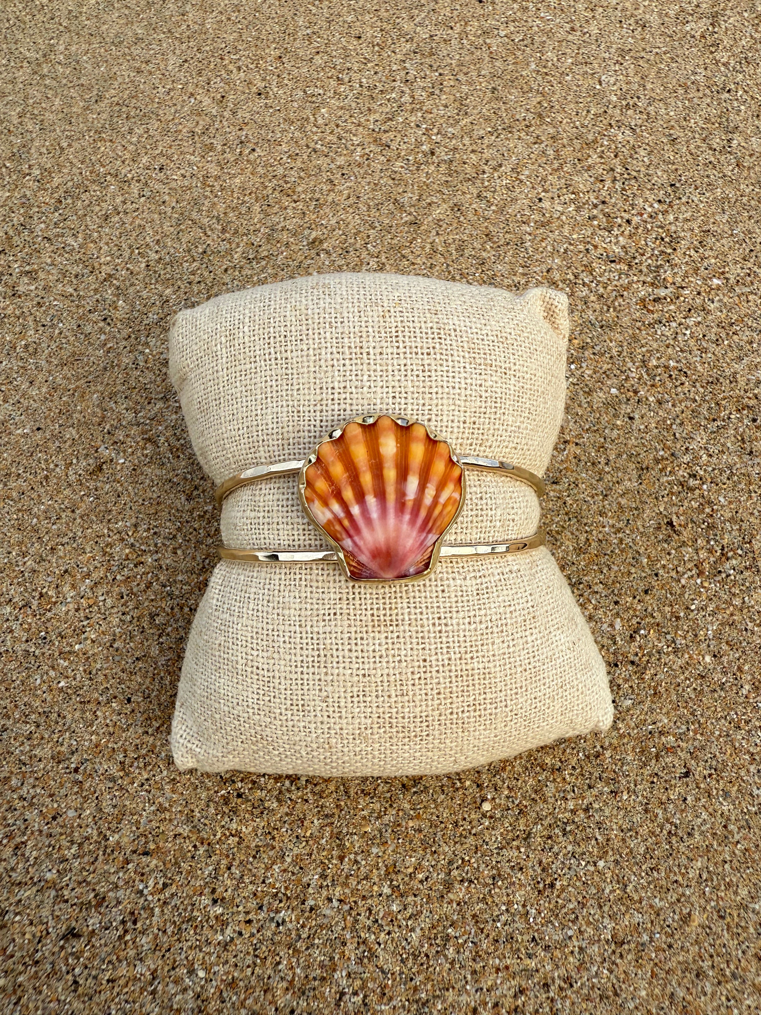 Double Banded Gold Orange Sunrise Shell Cuff Bracelet.