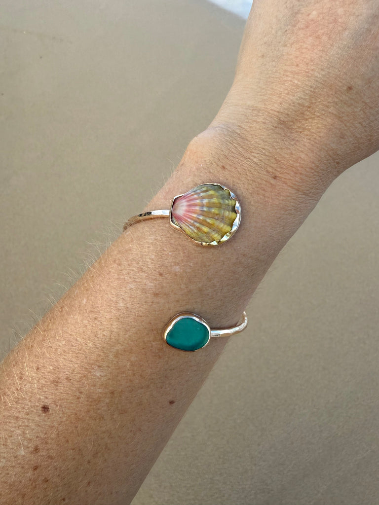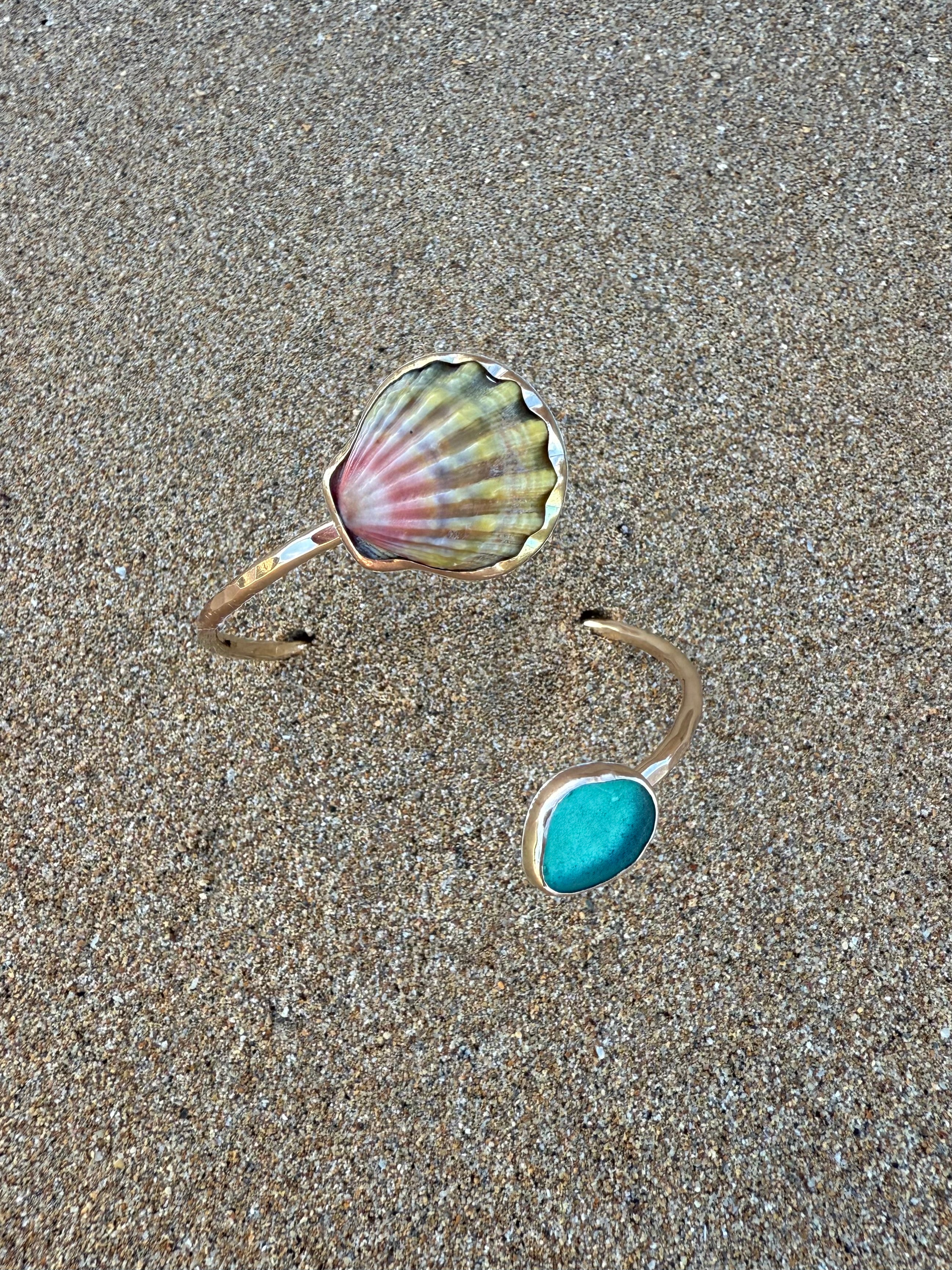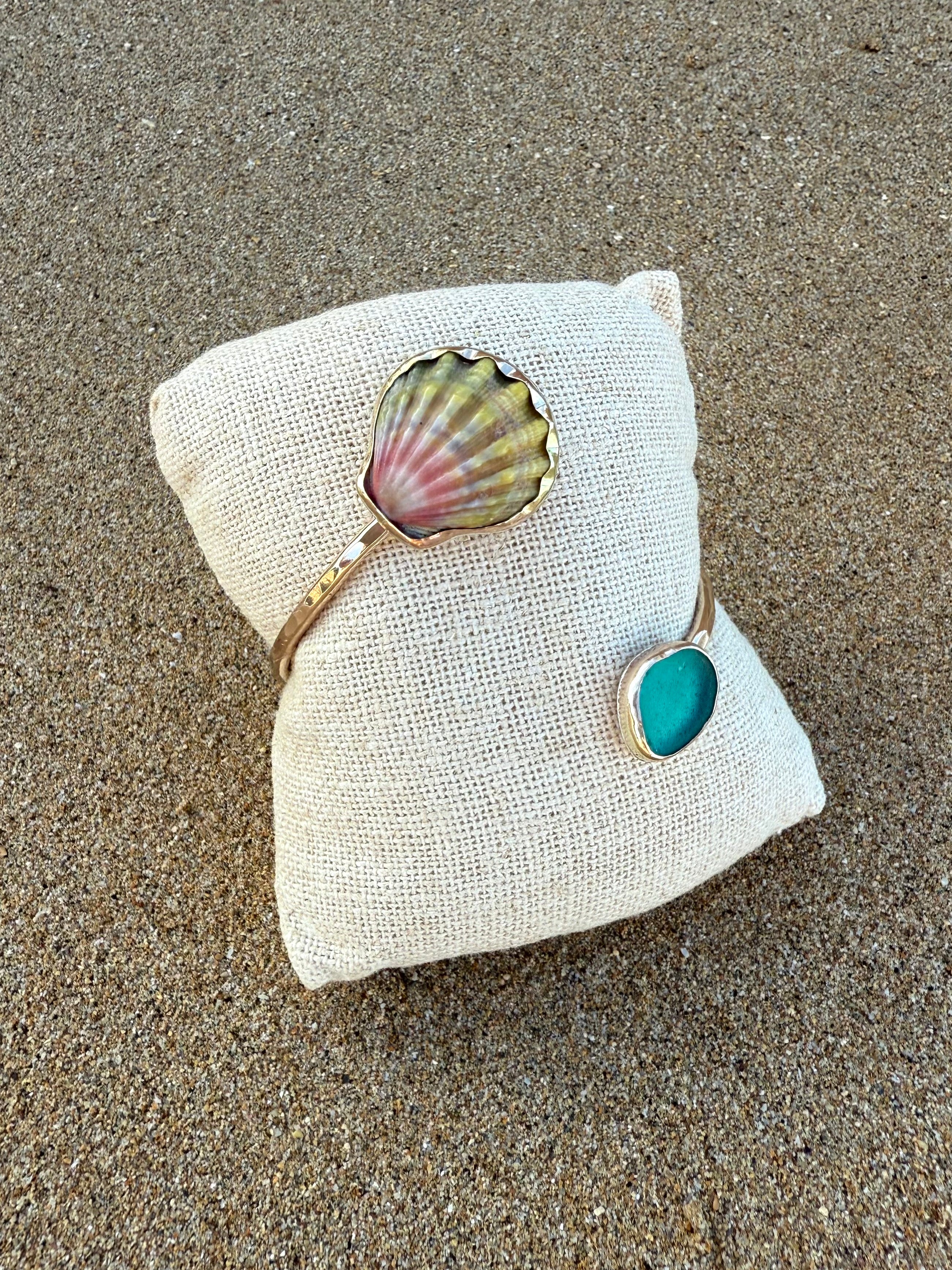 Gold Moonrise Shell and Teal Sea Glass Cuff Bracelet
