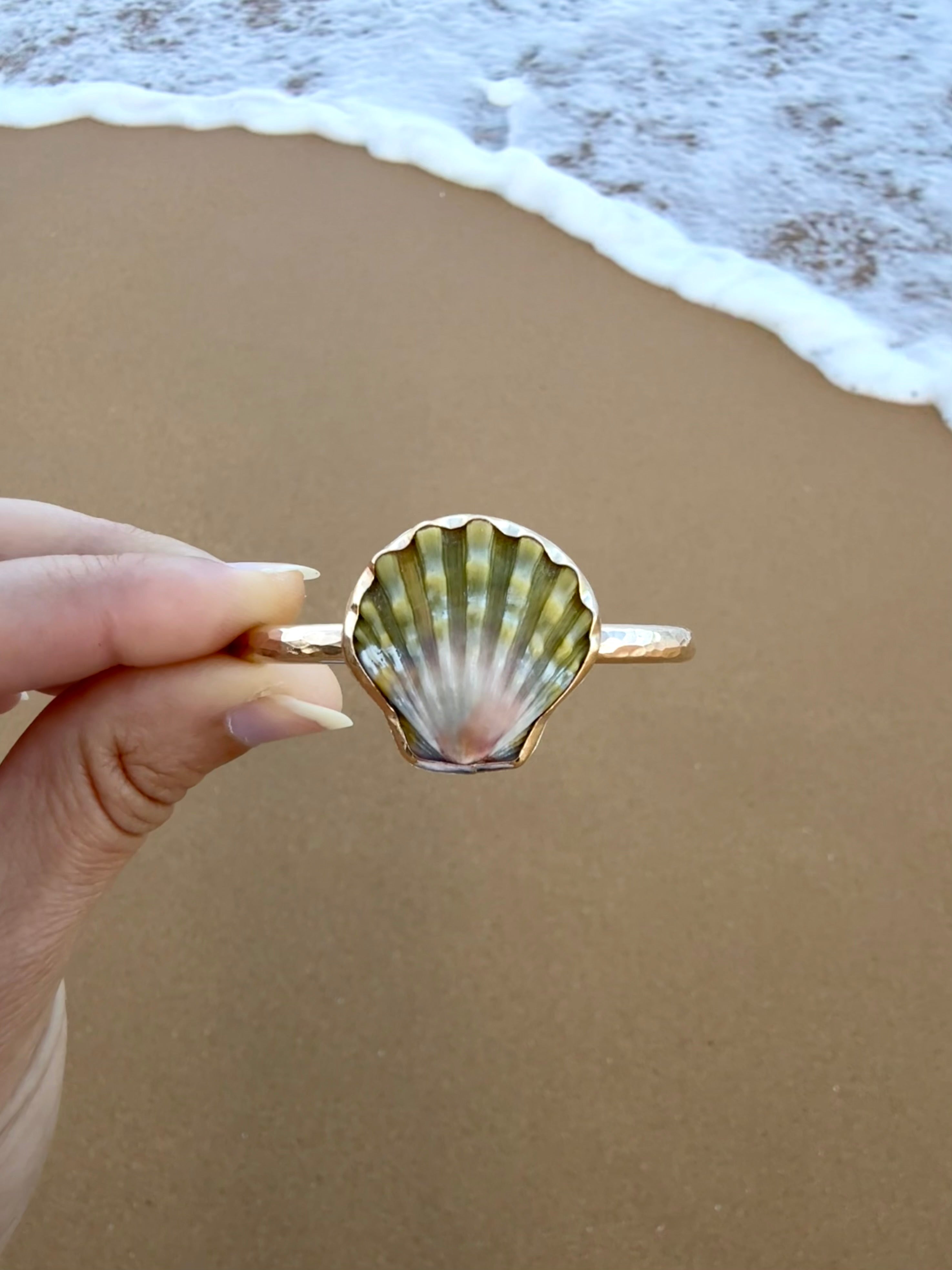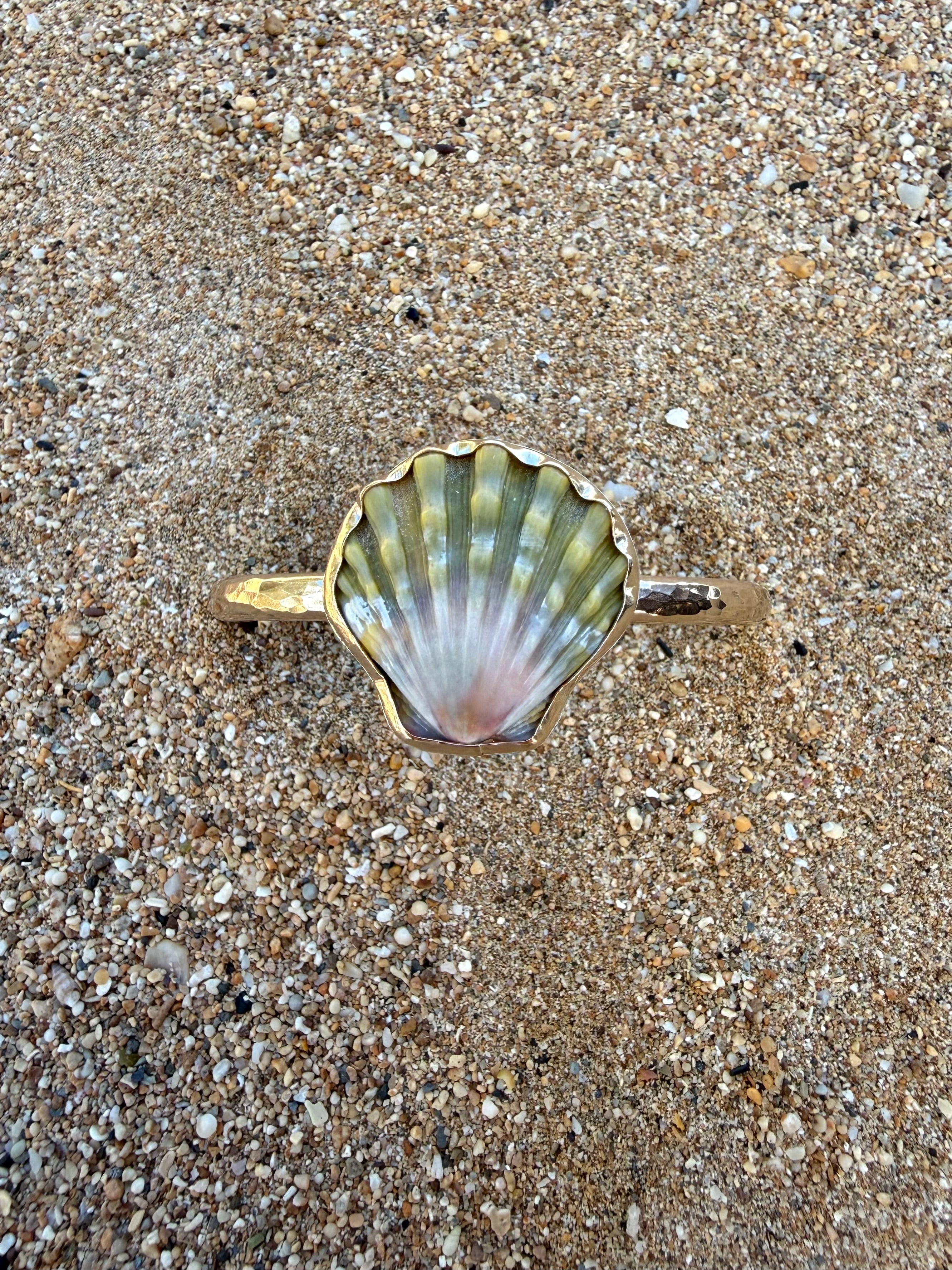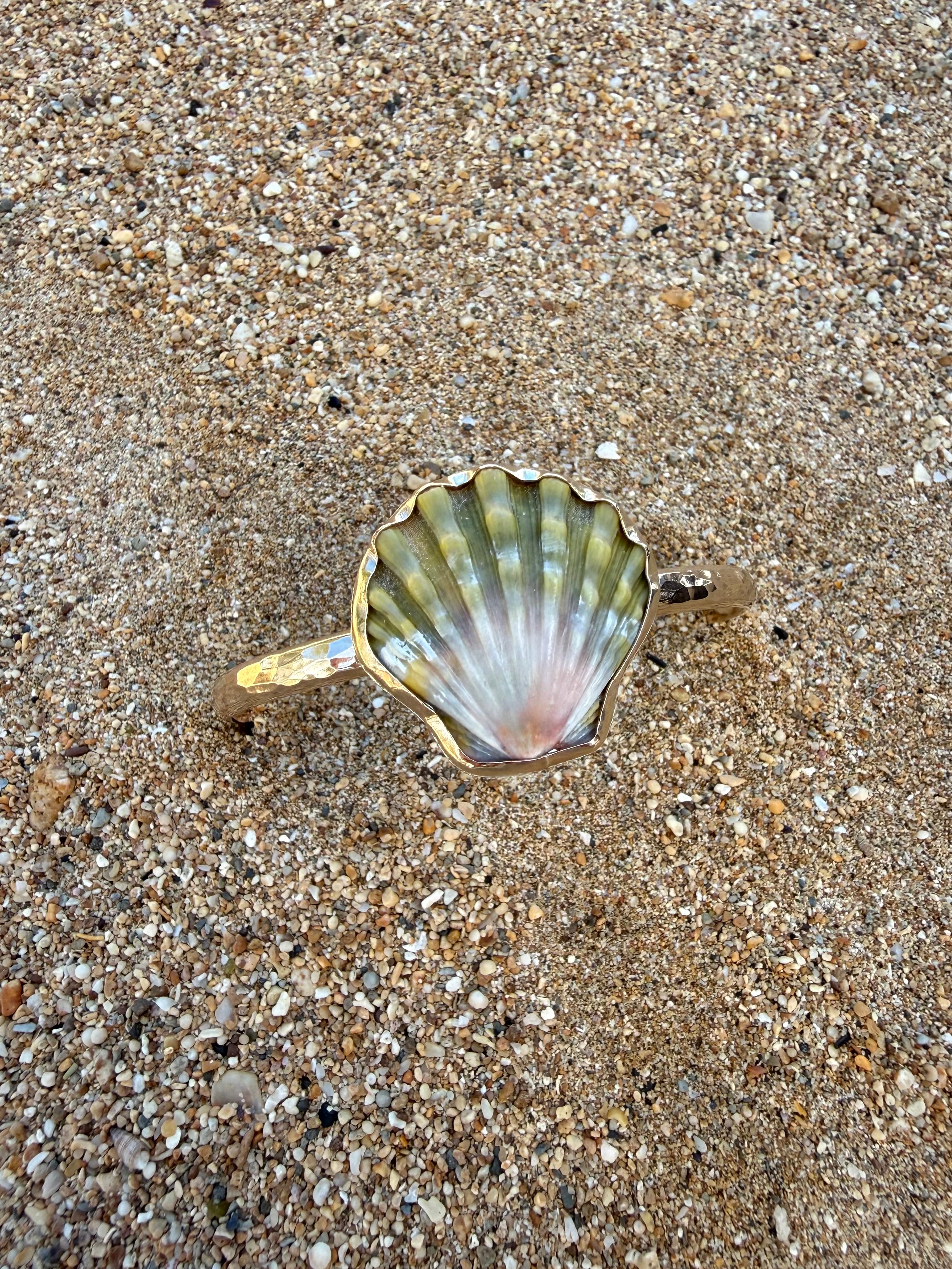 This beautiful moonrise shell has been hand forged into a sturdy 14K gold filled cuff that has been hammered for added dimension and shine. The bezel is also made of 14K gold fill and the backplate of the sunrise shell is sterling silver however it can not be seen when worn.