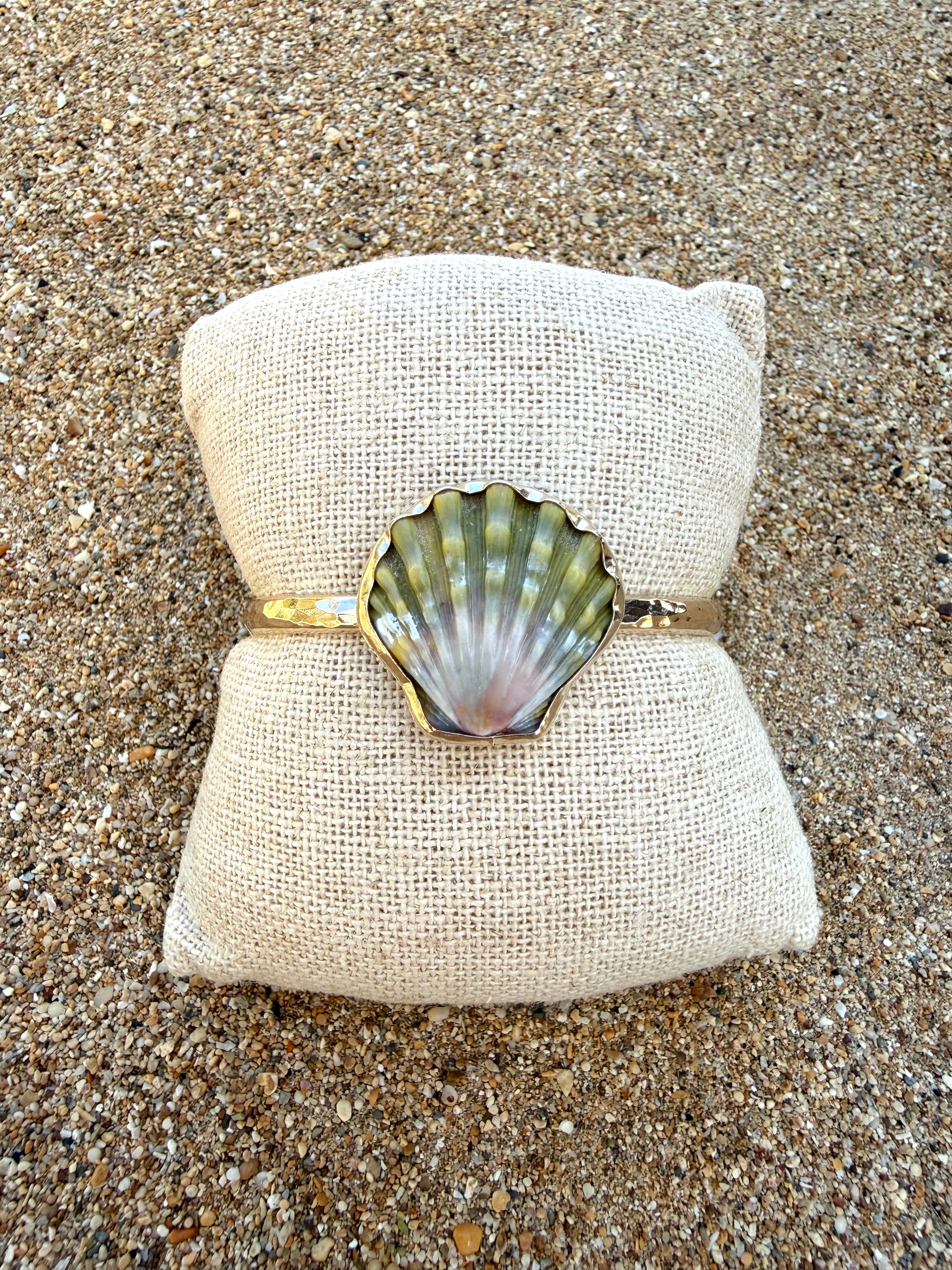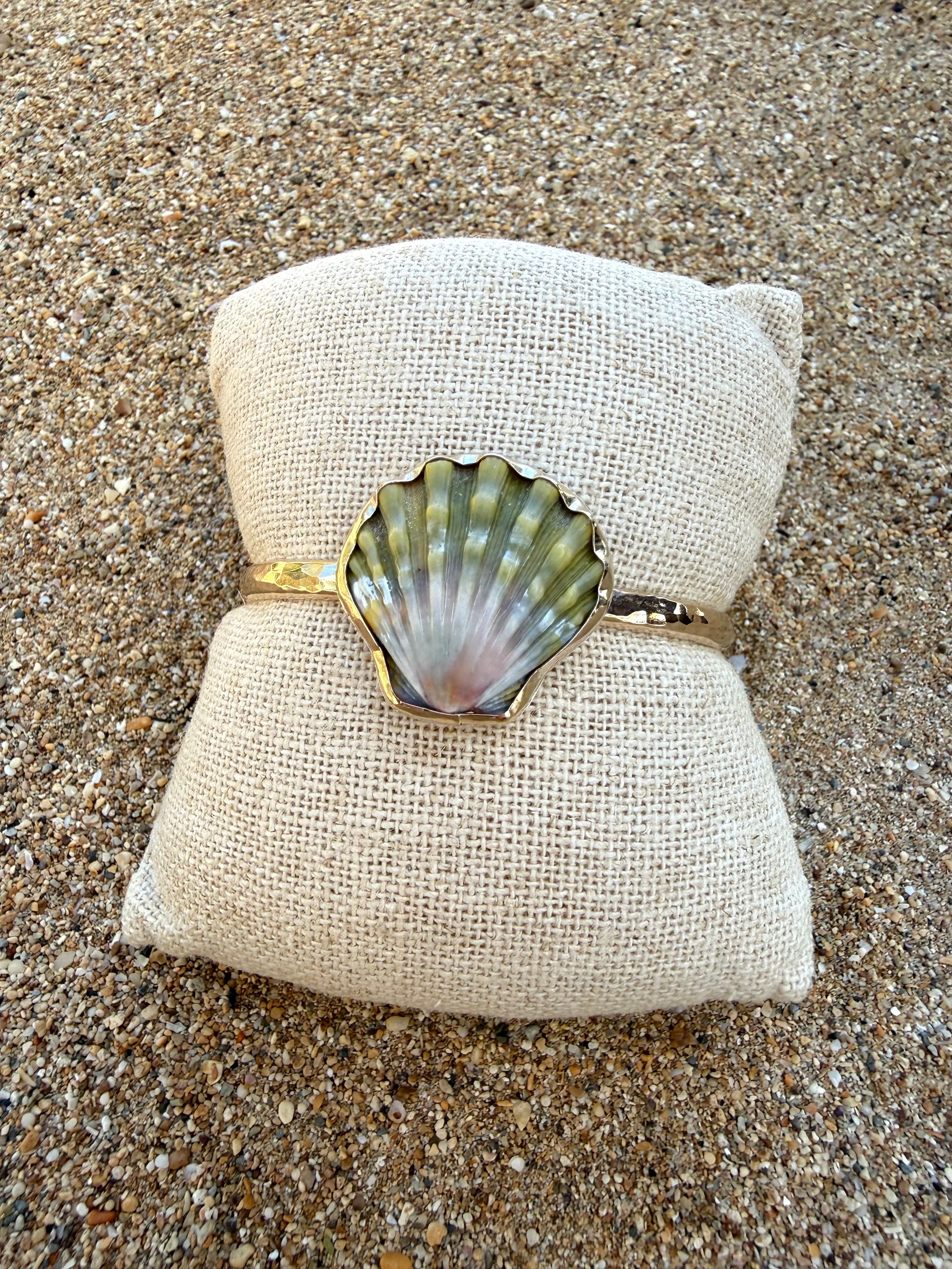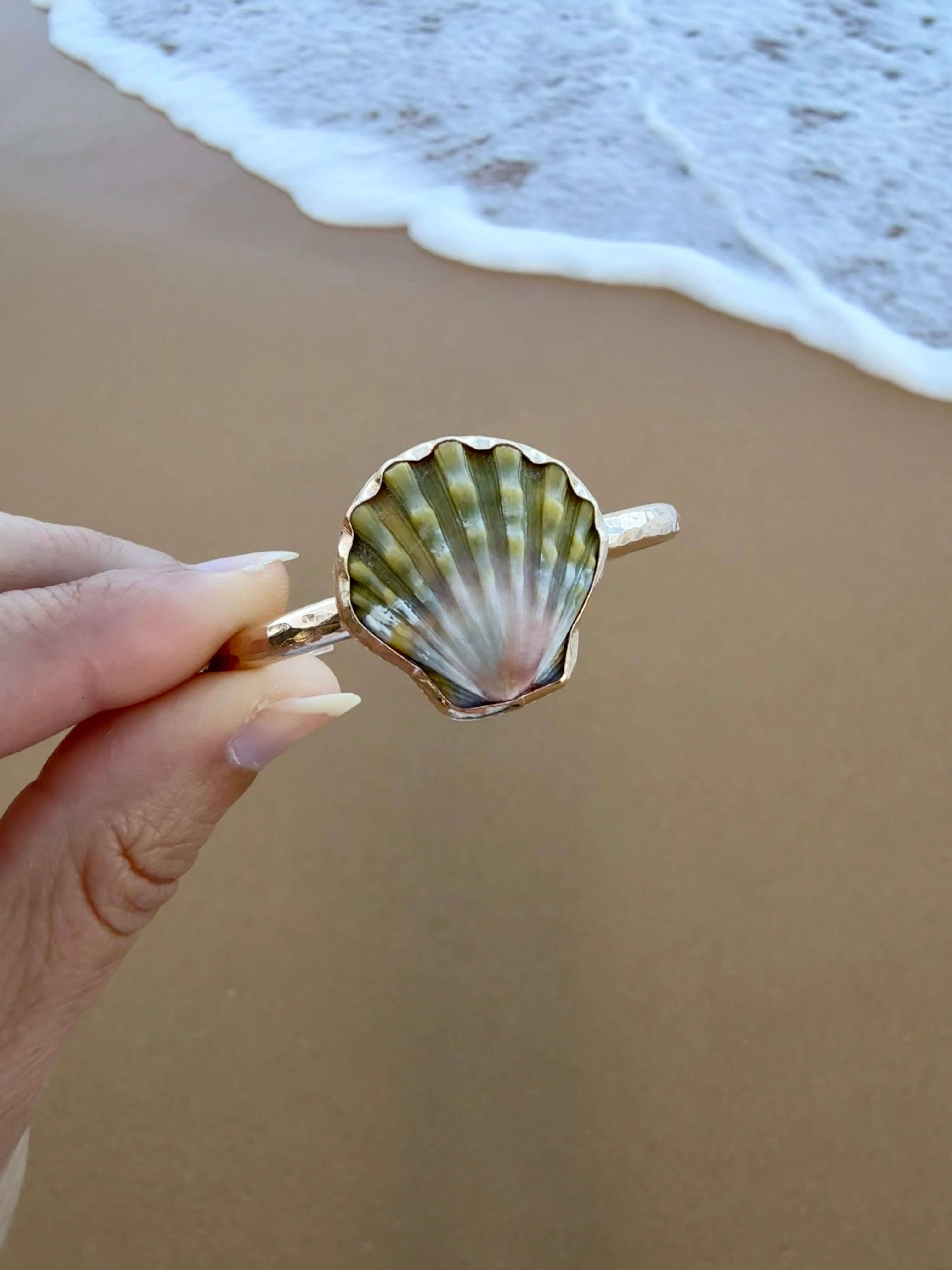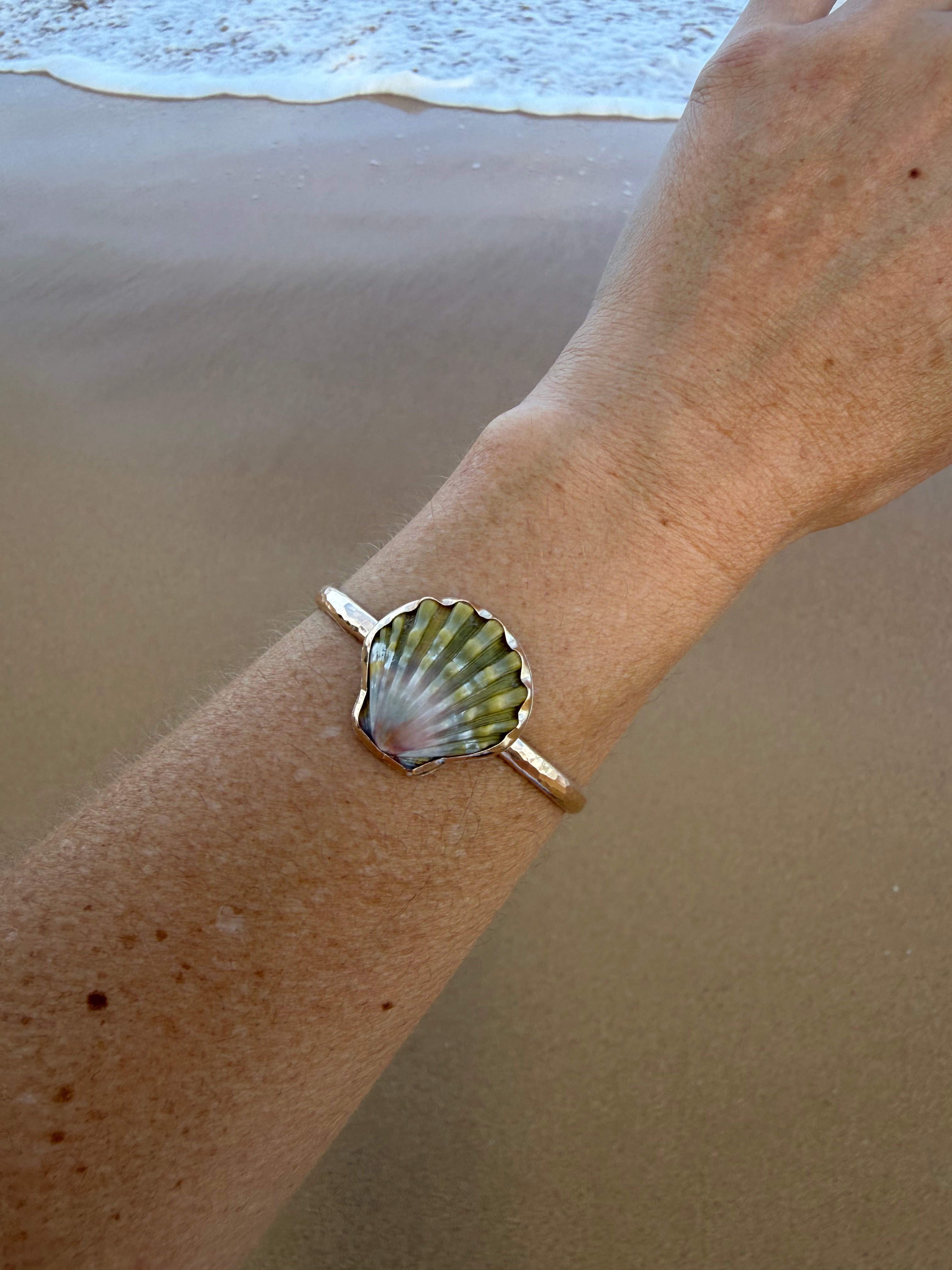This beautiful moonrise shell has been hand forged into a sturdy 14K gold filled cuff that has been hammered for added dimension and shine. The bezel is also made of 14K gold fill and the backplate of the sunrise shell is sterling silver however it can not be seen when worn.